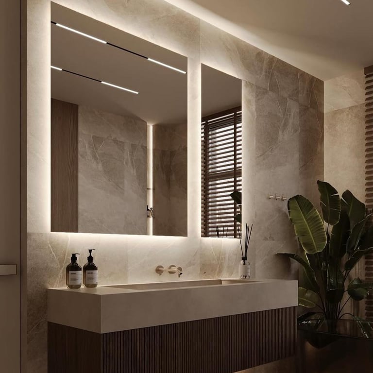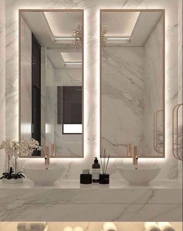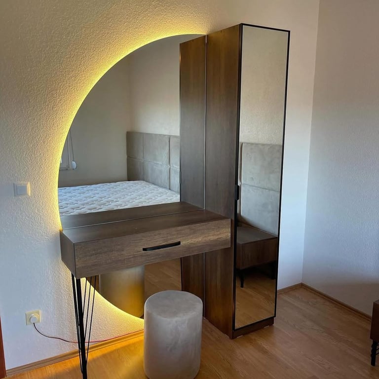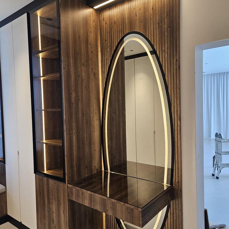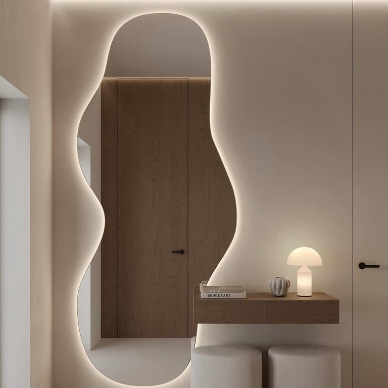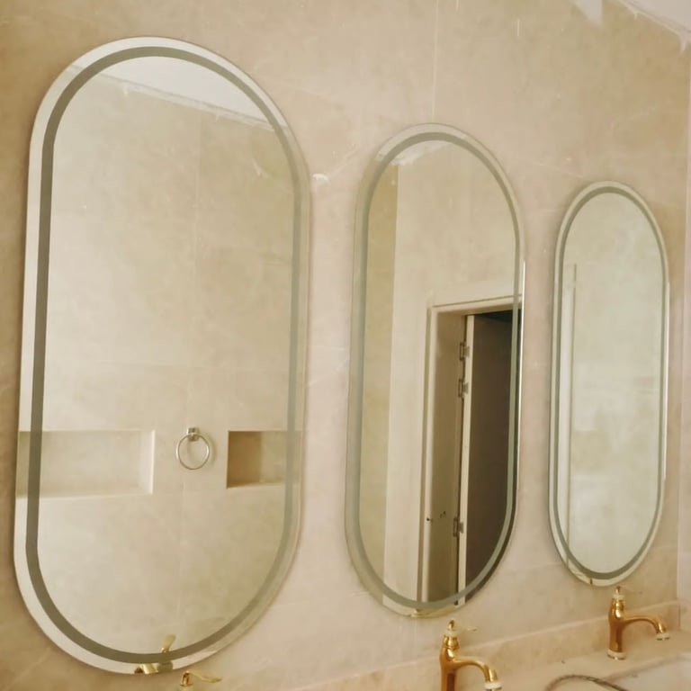 Custom wall mirrors and decorative glass pieces are crafted according to client needs.